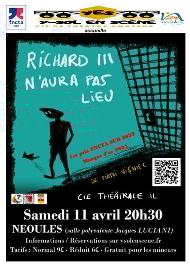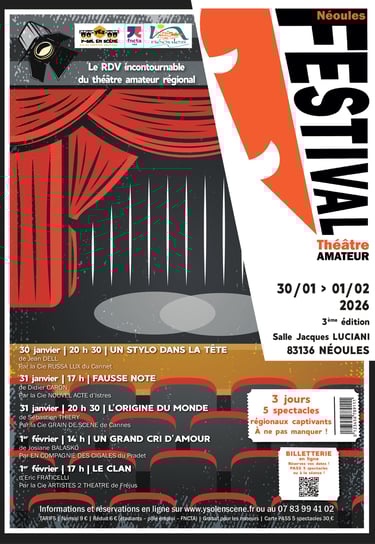 Y-sol En Scène s'est également engagée, avec le comité départemental et la municipalité de Néoules à organiser la programmation théâtrale néoulaise en sélectionnant trois à quatre spectacles régionaux qu'elle accueille depuis plus de quinze ans. Depuis 2024, notre compagnie organise également un festival régional au mois de février.